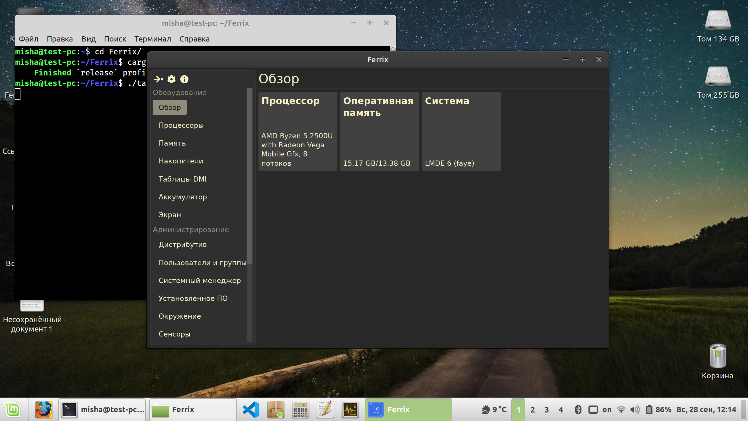 Ferrix содержит функции для отображения информации о сервисах systemd и списке установленного ПО (flatpak