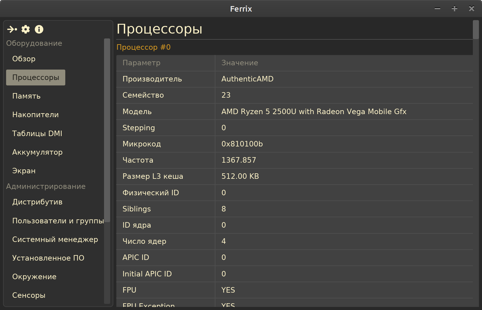 В отличие от Hardinfo и аналогов, в Ferrix почти всё отображается в виде лент с таблицами. Для некоторых пунктов таблицы приведены всплывающие подсказки с описанием параметров - просто наведите мышь на нужный пункт таблицы.