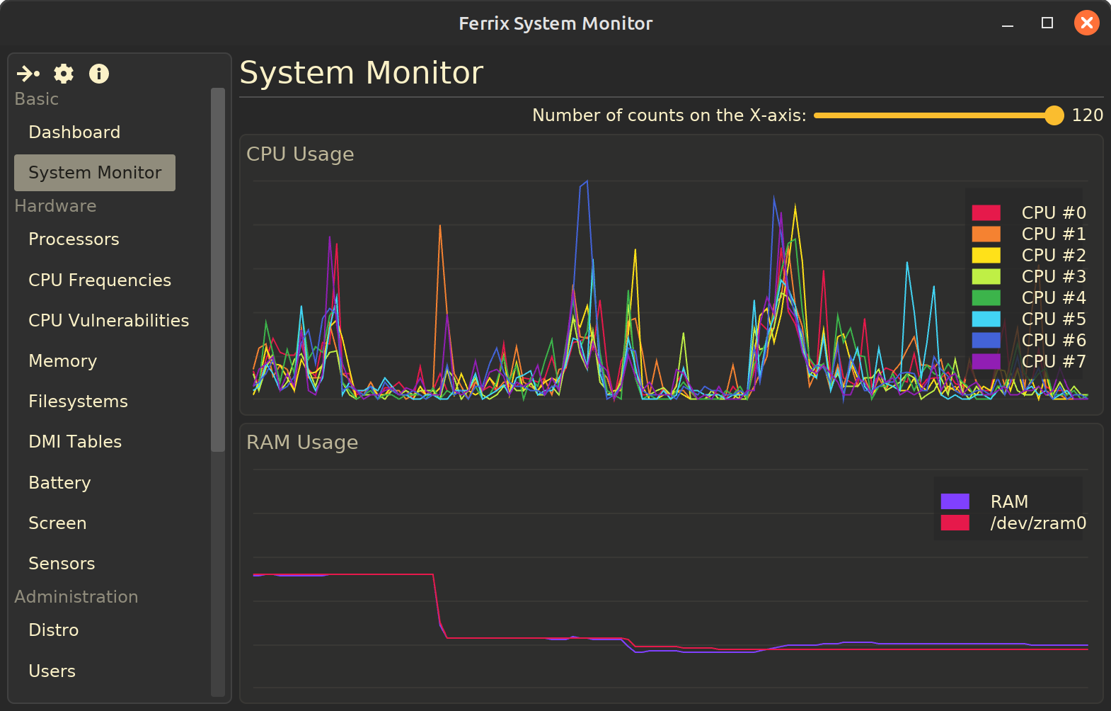 Следующая страница – “Системный монитор” (“System Monitor”). В отличие от дашборда, системный монитор предназначен уже для просмотра изменения использования ЦП, ОЗУ во времени. На эту страницу можно перейти как из сайдбара, так и нажав по карточке “CPU Usage” (“Нагрузка на ЦП”). Только если карточка “CPU Usage” показывает общую нагрузку на все ядра ЦП, то на графике будут отображены сведения о нагрузке на каждое ядро ЦП.